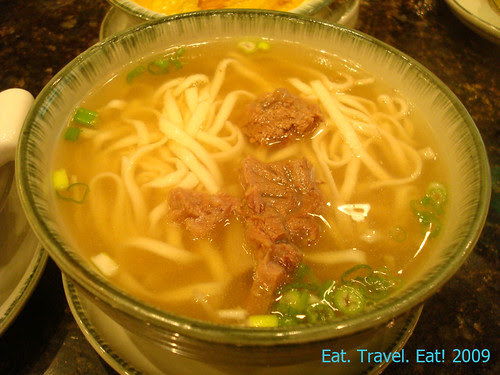 Pretty expensive for the price. The serving is again small and the noodles are slightly chewy. Broth as you can see is pretty clear and simple. It's a simple bowl of soup if you like that but it is expensive compared to Mandarin Noodle Deli across the street which has a big bowl of gelatinous , flavorful soup along with lots of beef and chewy noodles!